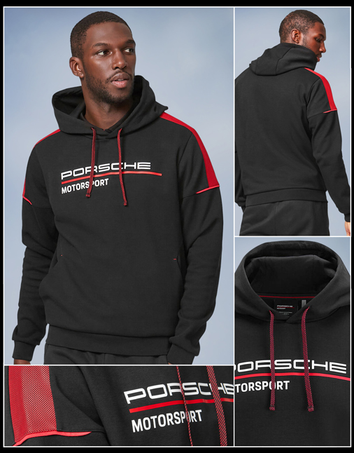 Hoodie homme Porsche Motorsport Matière 78% Coton / 22% Polyester - Capuche reglable par cordon Couleur Noir / Rouge - Grande poche devant avec 2 entrées latérales Porsche WAP124NFMS 94,95 € TTC / Incl. Taxes