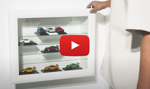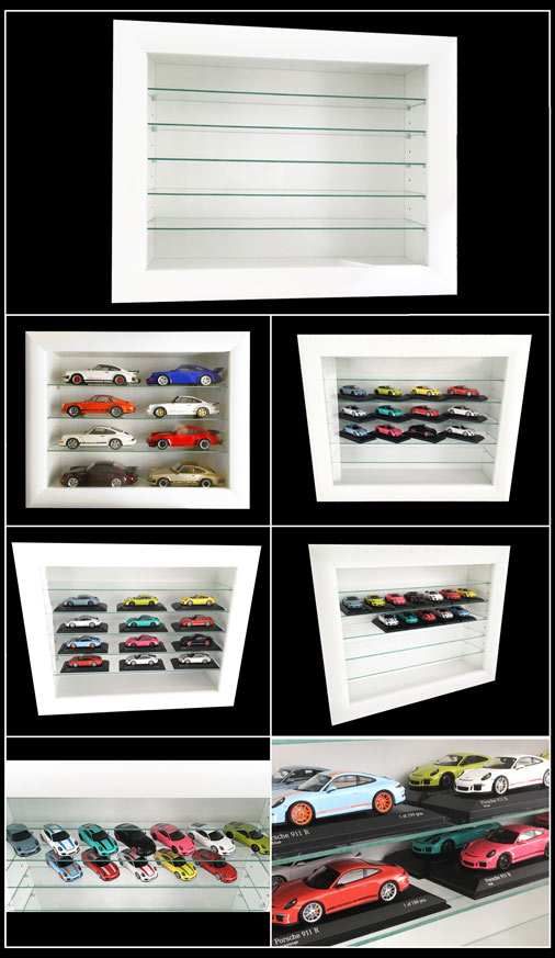 Vitrine Murale Pour 8 à 60 miniatures Porsche à l'échelle 1/43 1/24 1/18 Finition remarquable - Porte en verre encadrée en mélaminé Magnifique profil arrondi - Montage facile avec notice claire et détaillée Montage des charnières à droite, à gauche ou en haut Maintien de la porte par aimant - Plaques de fixations fournies Supports de tablettes garnis de caoutchouc antidérapant LxHxP : 62,5 x 50 x 17,3 cm