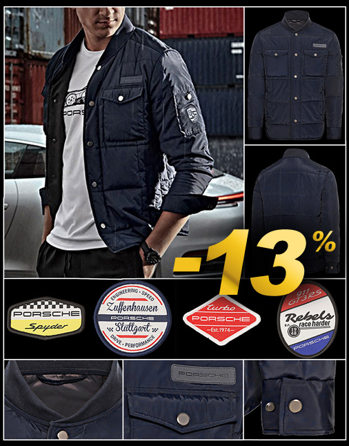 Veste homme Porsche Quatre badges brodés à coudre inclus - Taille ajustable par boutons Veste matelassée légèrement chatoyante - Couleur Bleu foncé Matière 100% polyester - Deux poches latérales / Une poche intérieure Porsche WAP721NPOR