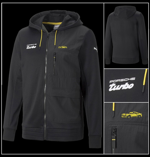 Hoodie homme Porsche Turbo by Puma Capuche avec cordon de serrage - Manches et taille élastiqués - Fermeture par Zip 1 poche sur la poitrine - Matière 41 % Coton / 59 % Polyester - Couleur Noir / Jaune Puma 534826-01 109,95 € TTC / Incl. Taxes