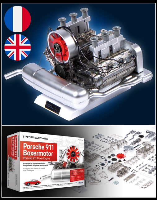 Moteur Porsche 911 - Français / English - Réplique entièrement fonctionnelle Nouvelles couleurs, avec effet métal plus réaliste - 290 pièces à monter soi-même Nouveau module son plus puissant avec sortie audio - Socle de présentation inclus Bouton de mise en marche avec cycle "son et lumières" - Fonctionne avec 3 piles AAA Superbe manuel illustré en français et en anglais format A4 Echelle 1/4 - Edition Porsche Museum