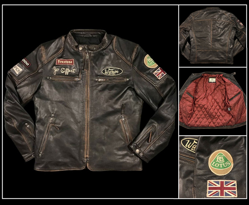 Veste en cuir homme Jo Siffert Look vintage avec badges brodés années 60 - Matière cuir de chèvre de qualité Doublure matelassée - Couleur marron foncé / finition vieilli Fabriquée à la main 429,95 € TTC / Incl. Taxes