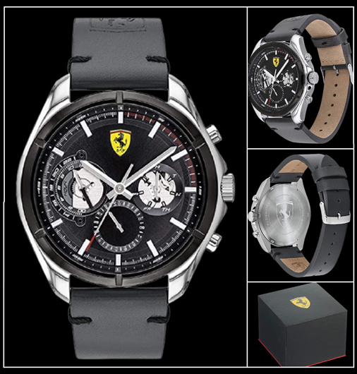 Montre Ferrari Pilota Evo Mouvement quartz - Fonction départ-arrêt avec mesure intermédiaire et tachymètre Trois fenêtres style compteur de vitesse - Fond couleur Noir Verre antireflets - Bracelet acier inoxydable - Fermoir par boucle déployante Boîtier étanche 10 ATM - Diamètre 44 mm - Garantie 2 ans Ferrari FE0830772 299,95 € TTC / Incl. Taxes