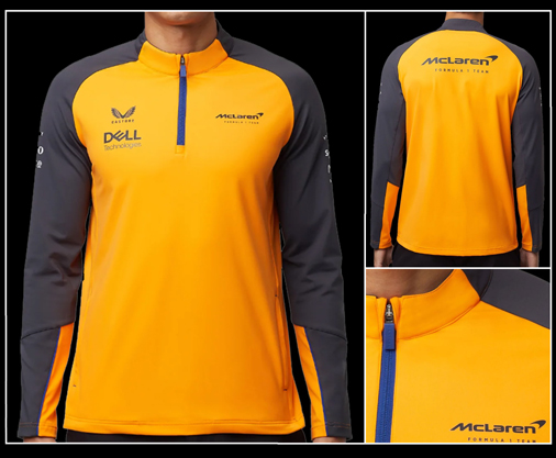 Pull homme McLaren F1 Fermeture 1/4 de zip sur l'avant - Matière : 75% nylon / 25% lycra 2 poches latérales zippées - Couleur Orange Papaya / Gris Anthracite McLaren F1 Team TM0880