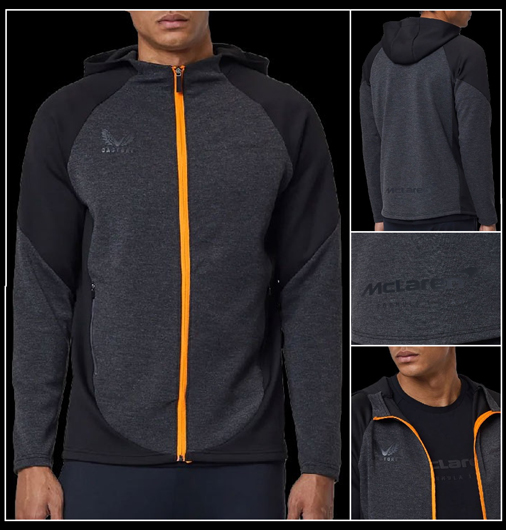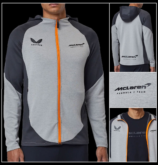Hoodie homme McLaren F1 Team Norris / Piastri Veste à capuche - Matière 50% viscose / 45% Polyester /5% Elasthanne Fermeture par zip - 2 poches latérales zippées - Couleur Gris clair / Anthracite / Orange McLaren F1 Team TM1006