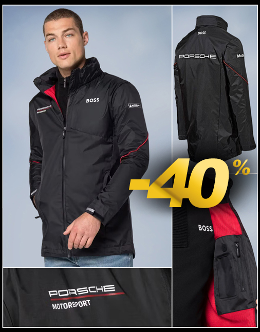 Veste mixte Porsche Motorsport BOSS / Hugo BOSS Couleur noir / détails rouge / blanc - Matière 100% Polyamide - Doublure 100% Polyester Capuche repliable dans le col - Col droit et fermeture par zip Poche intérieure smartphone avec passe-câble étanche 2 grandes poches côté et 1 poche poitrine zippées Porsche WAP438P0MS