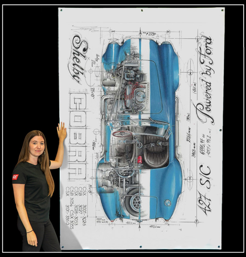 Reproduction d'une peinture originale de Sébastien Sauvadet Shelby Cobra 427 S/C 1965 225 x 150 cm - Toile PVC cirée 510 g/m² - 8 oeilletons pour l'accrochage 399,95 € TTC / Incl. Taxes