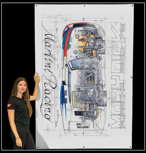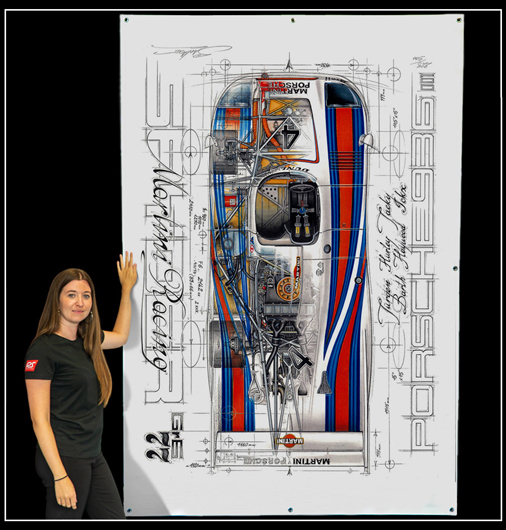 Reproduction d'une peinture originale de Sébastien Sauvadet Porsche 936 Martini n°4 - 24h Le Mans 1977 225 x 150 cm - Toile PVC cirée 510 g/m² - 8 oeilletons pour l'accrochage 399,95 € TTC / Incl. Taxes