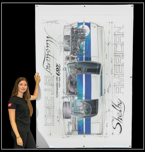 Reproduction d'une peinture originale de Sébastien Sauvadet Ford Mustang GT350 1965 225 x 150 cm - Toile PVC cirée 510 g/m² - 8 oeilletons pour l'accrochage 399,95 € TTC / Incl. Taxes