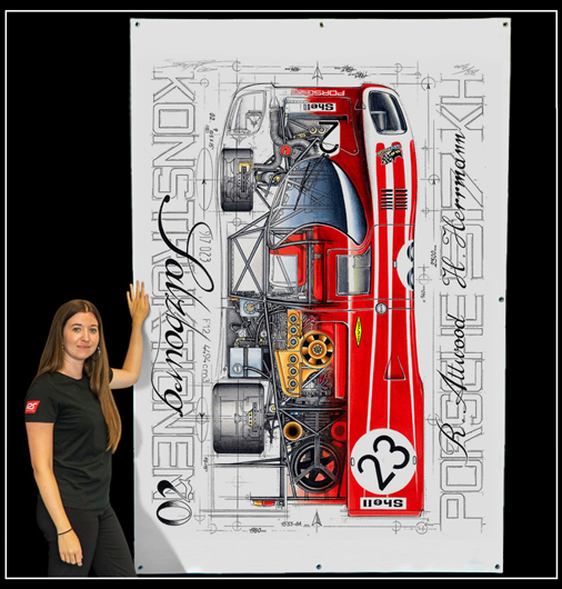 Reproduction d'une peinture originale de Sébastien Sauvadet Porsche 917 Salzburg n°23 - Vainqueur 24h Le Mans 1970 225 x 150 cm - Toile PVC cirée 510 g/m² - 8 oeilletons pour l'accrochage 399,95 € TTC / Incl. Taxes