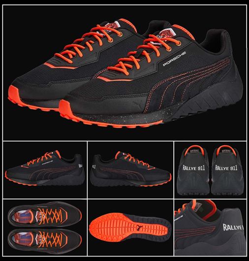 Chaussures homme Porsche 911 Rallye Speedfusion by Puma Matière Textile synthétique - Semelle rigide en Caoutchouc de haute qualité Renfort au niveau du talon - Couleur Noir / Orange Puma 307299-01 109,95 € TTC / Incl. Taxes