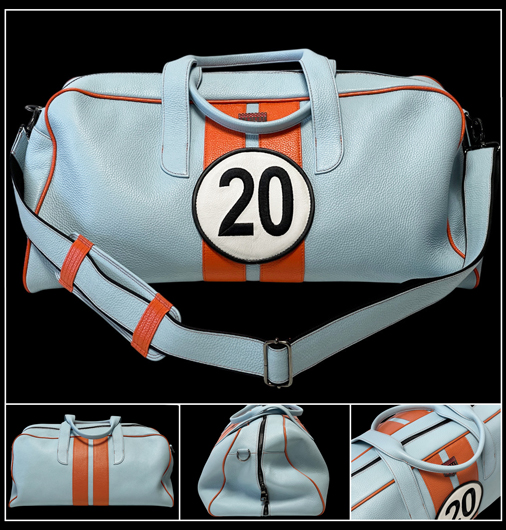 Sac de Voyage en cuir Vintage Race Matière 100% Cuir de veau - Doublure 100% coton - Dimensions 55 x 30 x 30 cm Couleur Bleu Clair / Orange - Double fermeture zippée - Poignées et bandoulière Grand compartiment central - 2 poches intérieures - Fabriqué artisanalement en Italie Edition Limitée - 50 exemplaire numérotés 469,95 € TTC / Incl. Taxes