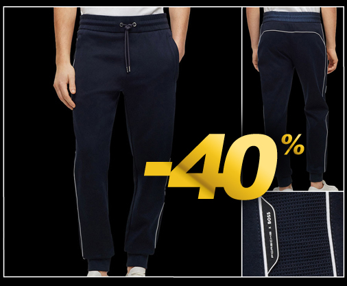 Pantalon homme Porsche x BOSS Matière 86% Coton / 14% Polyester - Cheville 95% Polyester / 5% Élasthanne Tissu interlock riche en coton mercerisé - Couleur Bleu foncé - Cordon de serrage 2 poches latérales - Finition déperlante protectrice BOSS LAMONT 260_PS 50486275_404