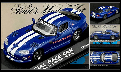Dodge Viper GTS Pace Car - Indy 500 1996 Bleu / Bandes Blanches 1/43 - Minichamps 430144023 Edition limitée - 4444 exemplaires 59,95 € TTC / Incl. Taxes