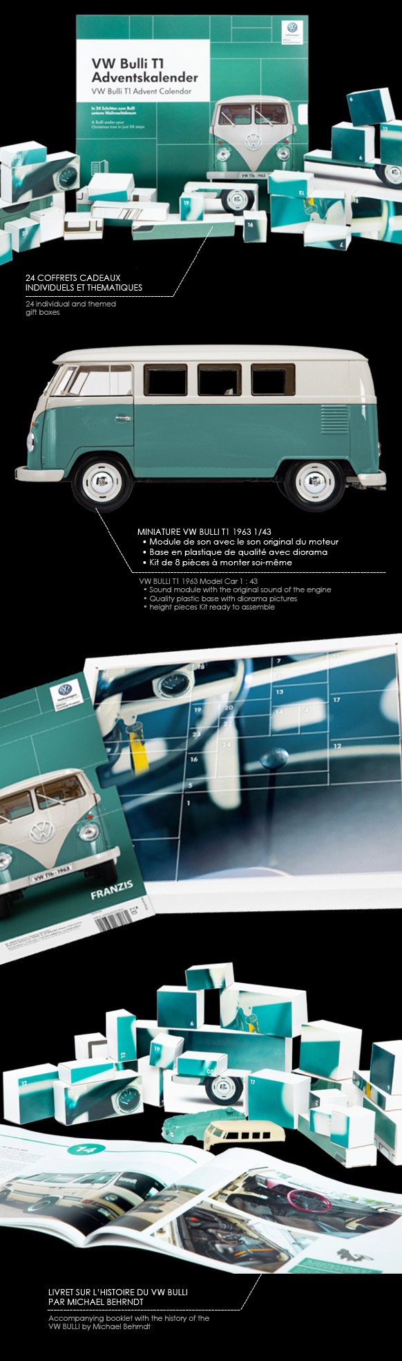 Calendrier de l'Avent - Volkswagen VW Bulli T1 24 coffrets cadeaux individuels et thématiques Miniature VW Bulli T1 1963 - Blanc / turquoise 1/43 - Kit de huit pièces à monter soi-même Base en plastique de qualité avec diorama Module de son avec le son original d'un moteur de VW Bulli T1 Livret d'accompagnement sur l'histoire du VW Bulli T1 par Michael Behrndt Requiert 2 piles 1,5 V (AA) non incluses 59,95 € TTC / Incl. Taxes