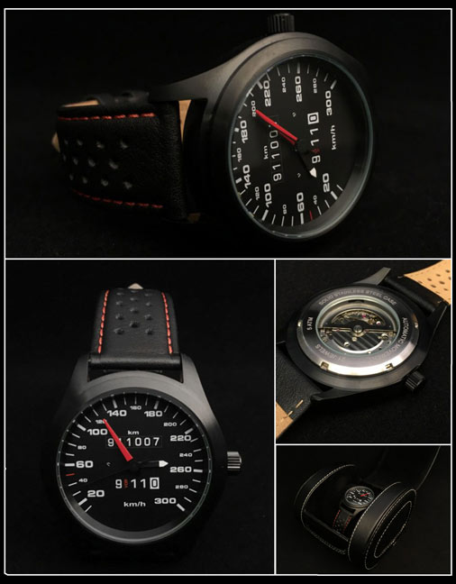 Montre Automatique Compteur de vitesse Porsche 911 - 300 km/h Mouvement mécanique automatique Miyota Japan Calibre 821A fréquence 21600 a/h, 21 rubis 40 heures de réserve de marche après remontage complet Verre minéral plat - Fond vissé transparent Bracelet perforé en cuir noir / surpiqué rouge Boitier en acier inoxydable noir brillant Etanche 5 ATM / 50 m - Diamètre 45 mm - Epaisseur 12.8 mm Made in Germany