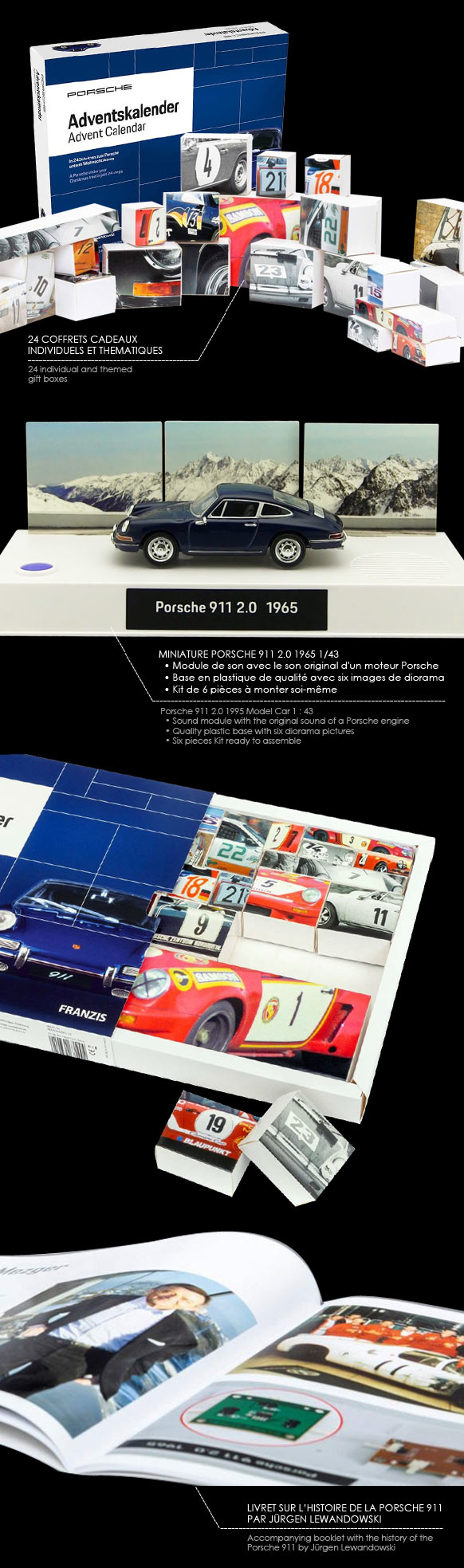 Calendrier de l'Avent - Porsche 911 2.0 1965 24 coffrets cadeaux individuels et thématiques Miniature Porsche 911 2.0 1965 - Bleu Bali 1/43 - Kit de six pièces à monter soi-même Base en plastique de qualité avec diorama Module de son avec le son original d'un moteur Porsche Livret d'accompagnement sur l'histoire de la Porsche 911 par Jürgen Lewandowski Requiert 2 piles 1,5 V (AA) non incluses 59,95 € TTC / Incl. Taxes