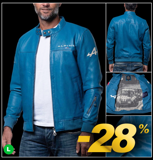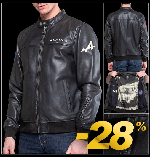 Veste en Cuir homme Alpine Matière 100% cuir de mouton - Fermeture par zip / Tirette en forme de volant sport Doublure 100% coton illustrée Alpine A210 24h Le Mans 1966 - 2 Couleurs disponibles 2 poches latérales - 2 poches intérieures - 1 poche zippée sur la manche Alpine 27024