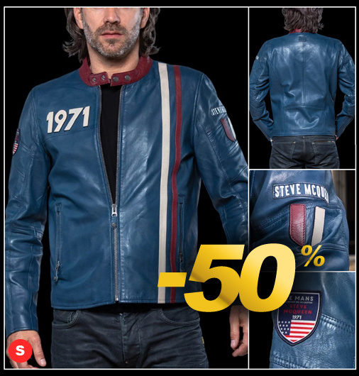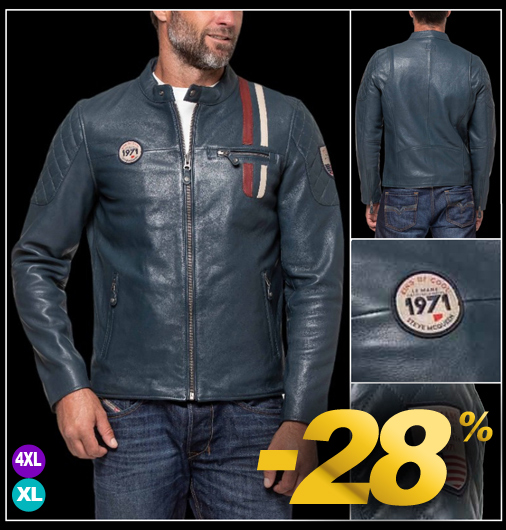 Veste en cuir homme 24h Le Mans Steve McQueen - Tailles XL / 4XL seulement Matière 100% cuir - Doublure 100% Coton - Couleur Bleu Royal Col droit - Fermeture zippée - Manches zippées 2 poches zippées - 2 poches intérieur Classic Legend Motors 27290-0012
