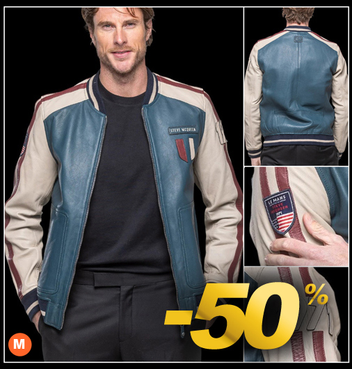 Veste en Cuir homme 24h Le Mans Steve McQueen - Taille M seulement Matière 100% cuir de mouton - Doublure 100% Coton - Fermeture zippée 2 Poches latérales zippées - Couleur Bleu royal / Beige / Bordeaux Classic Legend Motors 27504-0012