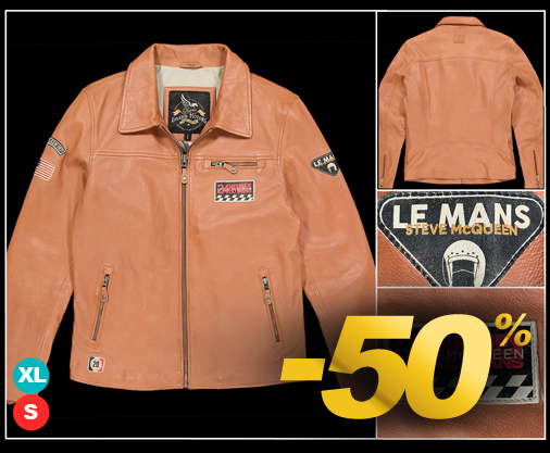 Veste en cuir homme 24h Le Mans - Tailles S / XL seulement Matière 100% cuir d'agneau de qualité - Doublure 100% coton Intérieur complet à l'effigie de Steve McQueen Nombreux détails surpiqués - Couleur Havane