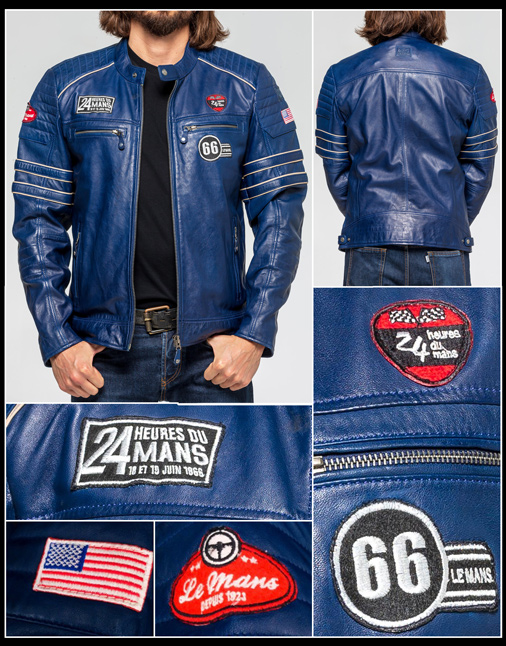 Men's Leather jacket 24h Le Mans - Mulsanne Royal blue Style pilote Racing Mulsanne Classic - Couleur bleu royal Matière 100% cuir d'agneau de qualité - Doublure 100% Coton / manches polyester 2 poches zippées - 2 poches poitrine zippées - 2 poches intérieur / 1 zippée Col pressionné / manches zippées - Empiècement aux épaules / coudes Impression N&B 24h du mans à l'intérieur