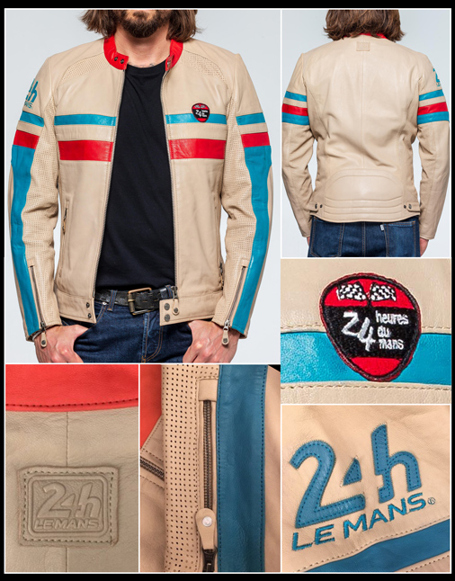 Men's Leather jacket 24h Le Mans - Hunaudieres Style pilote Racing Hunaudieres Classic - Couleur beige / turquoise / rouge Matière 100% cuir d'agneau de qualité - Doublure 100% Coton / manches polyester 2 poches zippées - 2 poches intérieur / 1 zippée Col pressionné / manches zippées - Empiècement aux épaules / coudes Impression N&B 24h du mans à l'intérieur