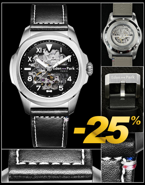 Montre automatique Eden Park Création Michel Herbelin garde-temps - Fabriquée en France - Boîtier acier 43 mm Bracelet cuir noir / surpiqûres blanches - Cadran noir avec mécanisme apparent Verre minéral saphir antireflets - Boîtier étanche 100m - Garantie 2 ans Eden Park EP1650SQ14