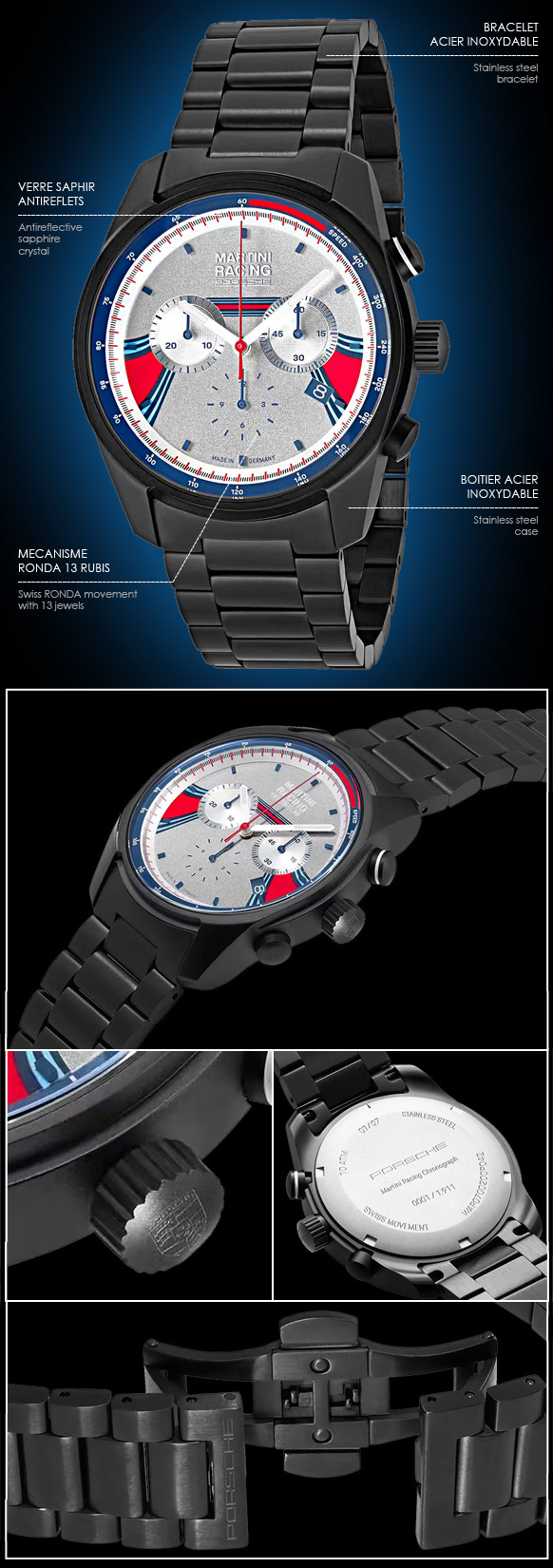 Montre Porsche Chrono Sport Martini Racing Mouvement Suisse RONDA 13 rubis - Bracelet en acier inoxydable avec liens brossés et polis Aiguilles luminescentes - Dos gravé avec numéro de série - Etanche à 100 mètres / 10 ATM Bracelet en acier inoxydable - Verre antireflets saphir - Fonction Stop intégrée Montage du bracelet et réglage de la longueur par deux goupilles à ressort Diamètre 37 mm - Epaisseur 12 mm - Garantie 2 ans Fabriqué en Allemagne - Porsche WAP0700200P042 699,95 € TTC / Incl. Taxes