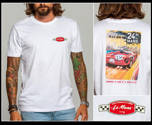 Men's T-shirt 24h du Mans 1961 Matière 100% coton biologique - Couleur Blanc Reproduction de l'affiche d'époque sur le dos Licence officielle 24h Le Mans