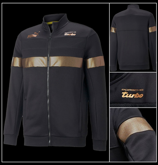 Veste homme Porsche Turbo by Puma Fermeture par Zip - Couleur noir / or - Matière 66% Polyester / 34% Coton Col droit / Poignets et taille côtelés - Poches latérales Puma 536423-001 99,95 € TTC / Incl. Taxes