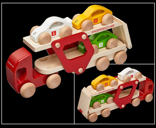 Jouet en bois Porsche - Camion et 3 voitures de course Voitures de course avec un design basé sur la 911 classique Couleur Rouge / Blanc / Jaune / Vert - En bois / métal - À partir de 3 ans Porsche WAP0400100NRTR 84,95 € TTC / Incl. Taxes