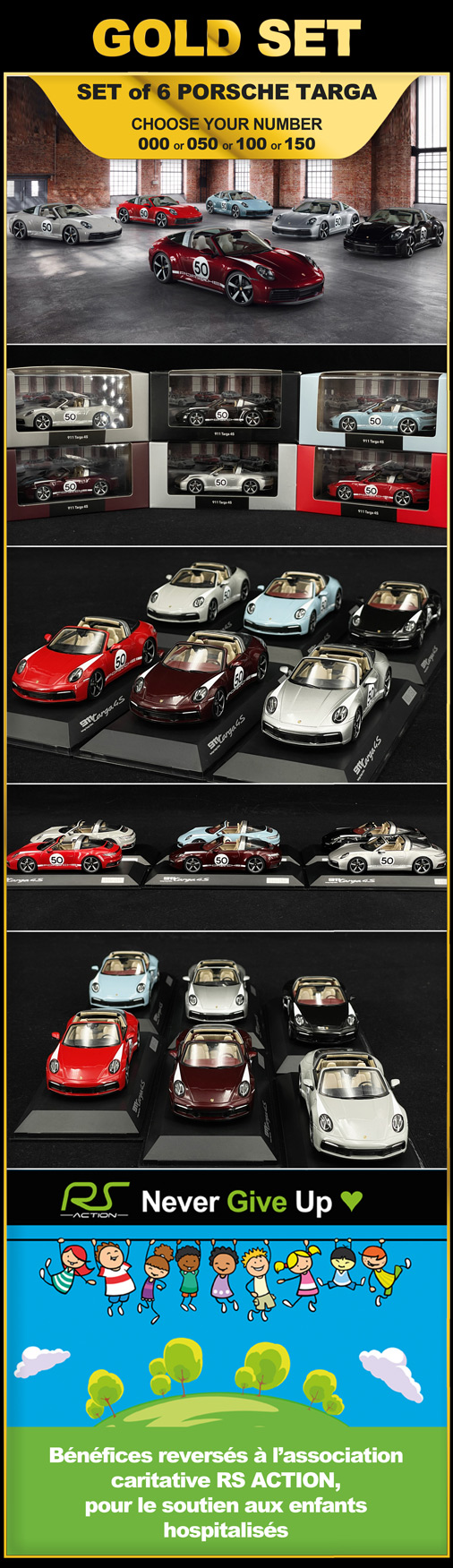 Plus que quelques jours avant Noël. La fête des petits et grands enfants est un moment de joie. Le père-noël RS Selection ne pouvait pas manquer ça ; il a préparé toute l'année une merveilleuse surprise exclusive pour RS Selection et pour vous : un ensemble de 6 Porsche Targa Heritage au 1/43.