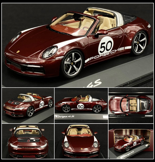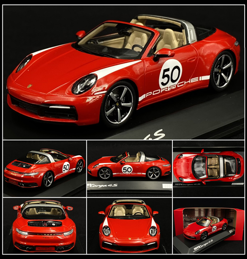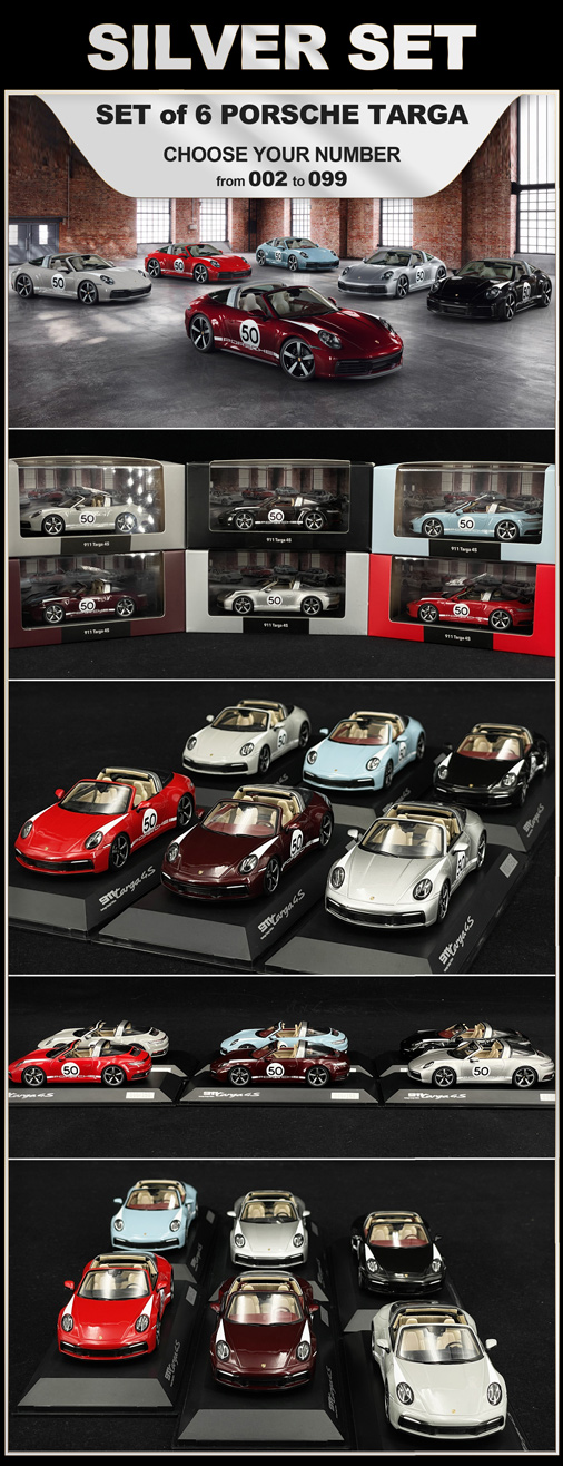 Présentées dans de jolies boites "ton sur ton" avec photo de présentation officielle Porsche, elles arborent les plus belles teintes : Gris Craie, Rouge Indien, Gris argent GT, Noir intense métallisé, bleu Meissen et Rouge Cerise. Produites par Spark avec un grand niveau de détail, ce sont les plus belles sur le marché.