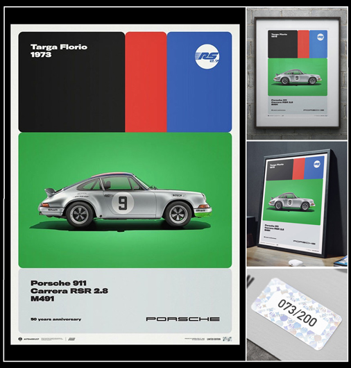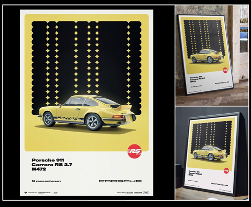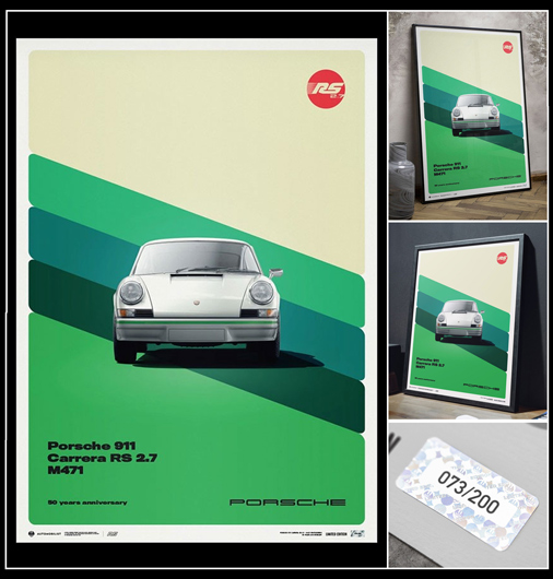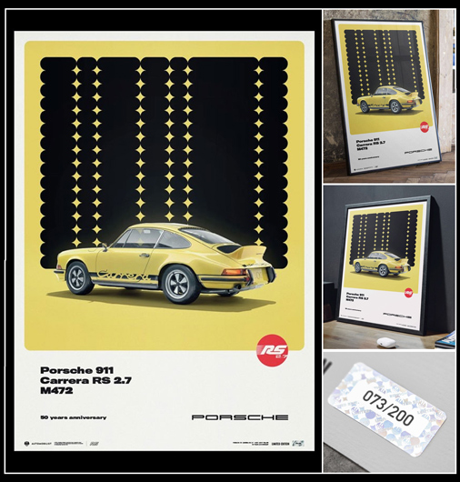 Poster Porsche 911 Carrera RS 2.7 1973 Par l'équipe d'artiste The Automobilist 50 x 70 cm - Papier 175g/m2 - Cadre non fourni Edition limitée - 200 exemplaires numérotés 69,95 € TTC / Incl. Taxes