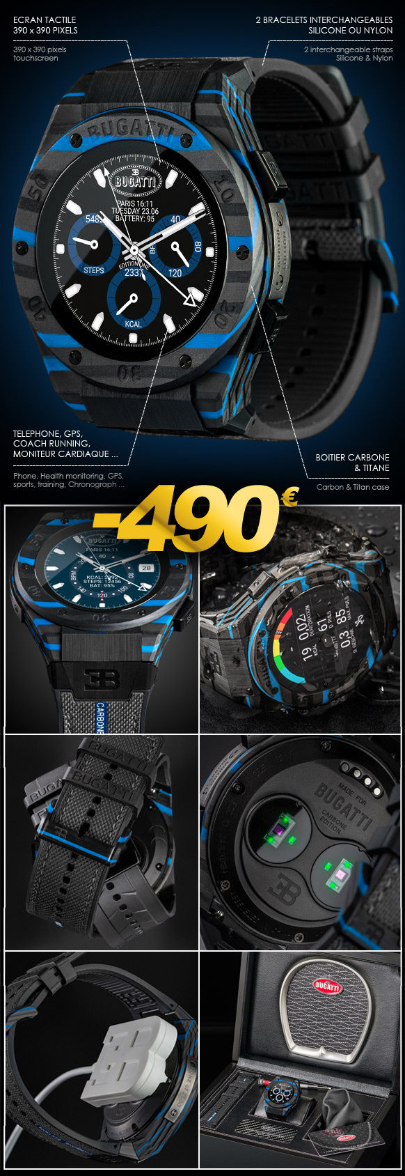 Montre Connectée Bugatti Carbone Viita Boitier usiné à partir d'un bloc de carbone - Ecran AMOLED 390x390 / Verre saphir Appels, textos, WhatsApp, Instagram, Facebook, e-mails, Skype, calendrier ... 2 Bracelets intergeangeables : Silicone ou Nylon - GPS / Galileo / Glonass - Gyroscope Bluetooth 5.2 - Accéléromètre combiné 6 axes - Photopléthysmographie - Suivi du sommeil 90 sports différents - Autonomie jusqu'à 12 jours - Couleur Noir / Bleu Bugatti Poids 94g - Chargeur USB-C avec adaptateur USB-A - Etanche 10 ATM Edition limitée - 2500 exemplaires
