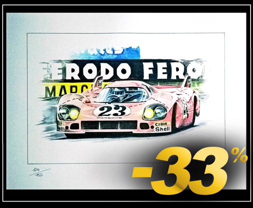 Reproduction d'un dessin original de Sébastien Sauvadet Porsche 917 Pink Pig Le Mans 1971 30 x 40 cm - Papier 250 g/m2 Édition limitée - 150 exemplaires numérotés et signés
