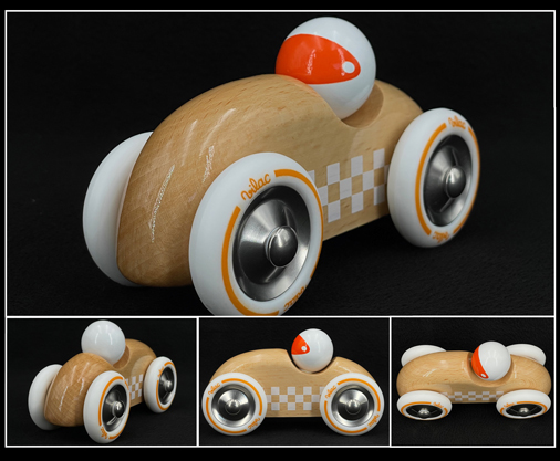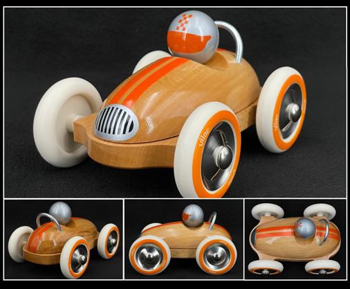 Miniature Vintage de course en bois Checkers Dimensions LxHxP : 14,5 x 6,5 x 8,5 cm - Livré dans une jolie boîte, prête à offrir Matière Bois Laqué, roues en métal et caoutchouc - Couleur Bois Naturel / Blanc Made in France - Vilac 2283S 26,95 € TTC / Incl. Taxes
