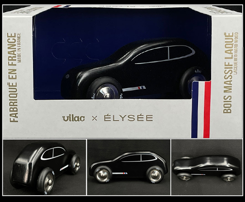 Miniature en bois DS 7 Crossback du Président de la République Française Dimensions LxHxP : 22,5 x 8 x 9 cm - Livré dans une jolie boîte, prête à offrir Matière Bois Laqué, roues en métal et caoutchouc - Couleur Noir Made in France - Vilac 9001EPR 39,95 € TTC / Incl. Taxes
