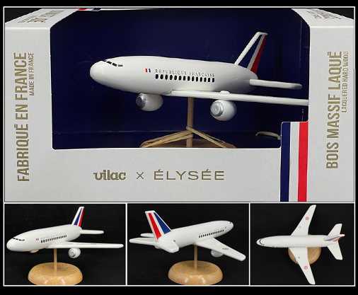 Miniature en bois Airbus A330-200 du Président de la République Française Dimensions LxHxP : 23 x 8 x 22 cm - Livré dans une jolie boîte, prête à offrir Matière Bois Laqué - Support rotation à 360° - Couleur Blanc Made in France - Vilac 9004EPR 64,95 € TTC / Incl. Taxes