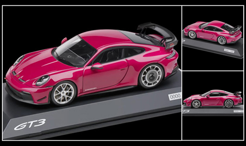La miniature Spark est magnifique, avec le nouveau splitter avant, les flaps et des dive planes. Le gros diffuseur arrière est très bien réalisé ainsi que l’aileron arrière agrandi qui repose sur un panneau carbone en remplacement de la vitre arrière. Les 8 ailettes de toit sont bien présentes ainsi que les aérodiscs (caches roues) qui permettent de l’identifier au premier regard eu complément de l’inscription latérale « Manthey ». Superbe !