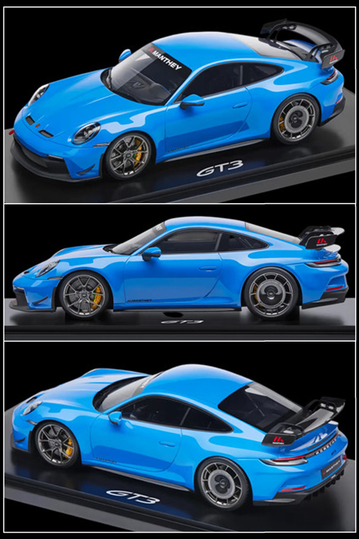 The Spark model is stunning, featuring the new front splitter, flaps, and dive planes. The large rear diffuser is very well executed, as is the enlarged rear wing, which sits on a carbon panel replacing the rear window. The 8 roof fins are clearly present, along with the aerodiscs (wheel covers) that make it instantly recognizable, complemented by the “Manthey” side lettering. Superb!
