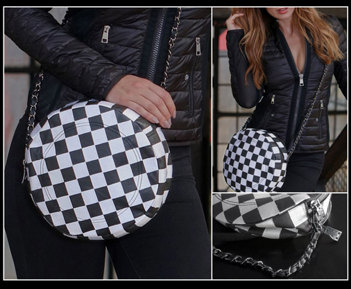 Sac à main cuir Racing Couleur noir / blanc - Matière 100% Cuir / Doublure 100% Coton 2 Compartiments principaux fermeture par zip 1 poche pour portable intérieur - 1 poche zippées intérieur Bandoulière cuir et chaîne métal - Diamètre 25 cm