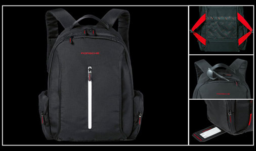 Sac à Dos Motorsport Porsche Design Compartiment principal rembourré pour ordinateur portable Poche rembourrée pour lunettes de soleil 2 poches latérales et poche zippée devant Rabat avant avec organisateur et sangle pour casque, veste ou parapluie Doublure avec pression Porsche - Porte étiquette d'adresse Couleur noir - Dimensions 45 x 38 x 22 cm Porsche Design WAP0502300G 129,90 € TTC / Incl. Taxes
