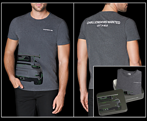 T-shirt homme Porsche 911 GT3 RS Couleur gris foncé chiné - Matière 100% Coton doux au toucher Présenté dans une boîte métallique exclusive Carte postale avec explication du motif incluse Porsche Design WAP811 49,95 € TTC / Incl. Taxes