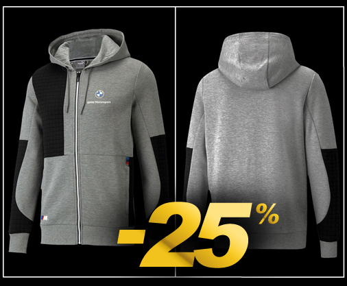Hoodie homme BMW Motorsport - Tailles S / M / XL seulement Poches latérales zippées - Poignets et taille côtelés - Fermeture par Zip Effets matelassé sur poitrine et manches - Couleur Gris / Noir Matière 77% Coton / 23% Polyester Puma 531187-03
