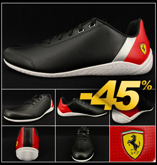 Chaussures Homme Ferrari - Tailles 39 / 40 / 43 seulement Couleur Noir / Rouge / Blanc - Matière principale cuir - Semelle sculptée comme un pneu Renfort au talon - Coupe basse - Licence officielle Scuderia Ferrari