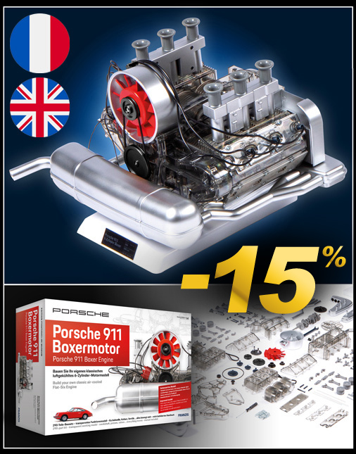 Moteur Porsche 911 - Français / English - Réplique entièrement fonctionnelle Nouvelles couleurs, avec effet métal plus réaliste - 290 pièces à monter soi-même Nouveau module son plus puissant avec sortie audio - Socle de présentation inclus Bouton de mise en marche avec cycle "son et lumières" - Fonctionne avec 3 piles AAA Superbe manuel illustré en français et en anglais format A4 Echelle 1/4 - Edition Porsche Museum