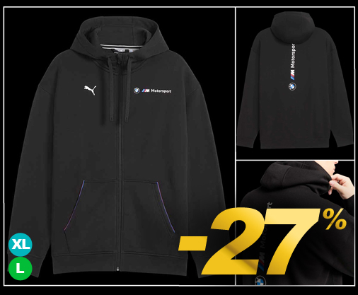 Hoodie homme BMW Motorsport - Tailles L / XL seulement Matière 68% Coton / 32% Polyester - Couleur Noir - Fermeture zippée 2 poches latérales - Capuche réglable Puma 630629-01