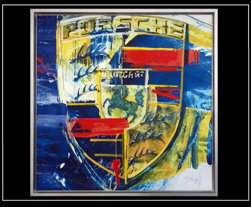 Ecusson Porsche en couleur - Reproduction d'une peinture originale de Uli Hack Chaque toile est personnalisée par une finition à l'acrylique Chaque reproduction est ainsi unique 50 x 50 cm - Cadre aluminium - Toile / Chassis bois 499,95 € TTC / Incl. Taxes